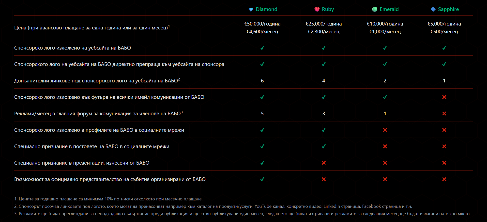 - Персонализирани спонсорски пакети, които могат да бъдат създадени в сътрудничество с нашия екип, за да отговорят на специфичните нужди и цели на вашата организация.